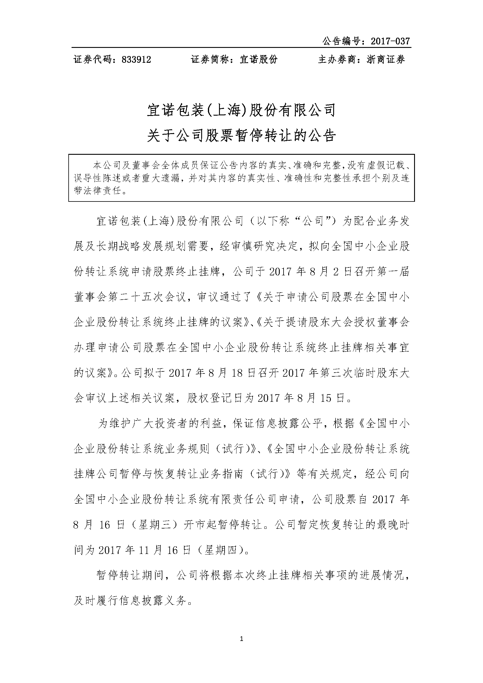 [临时公告]宜诺股份:关于公司股票暂停转让的公告