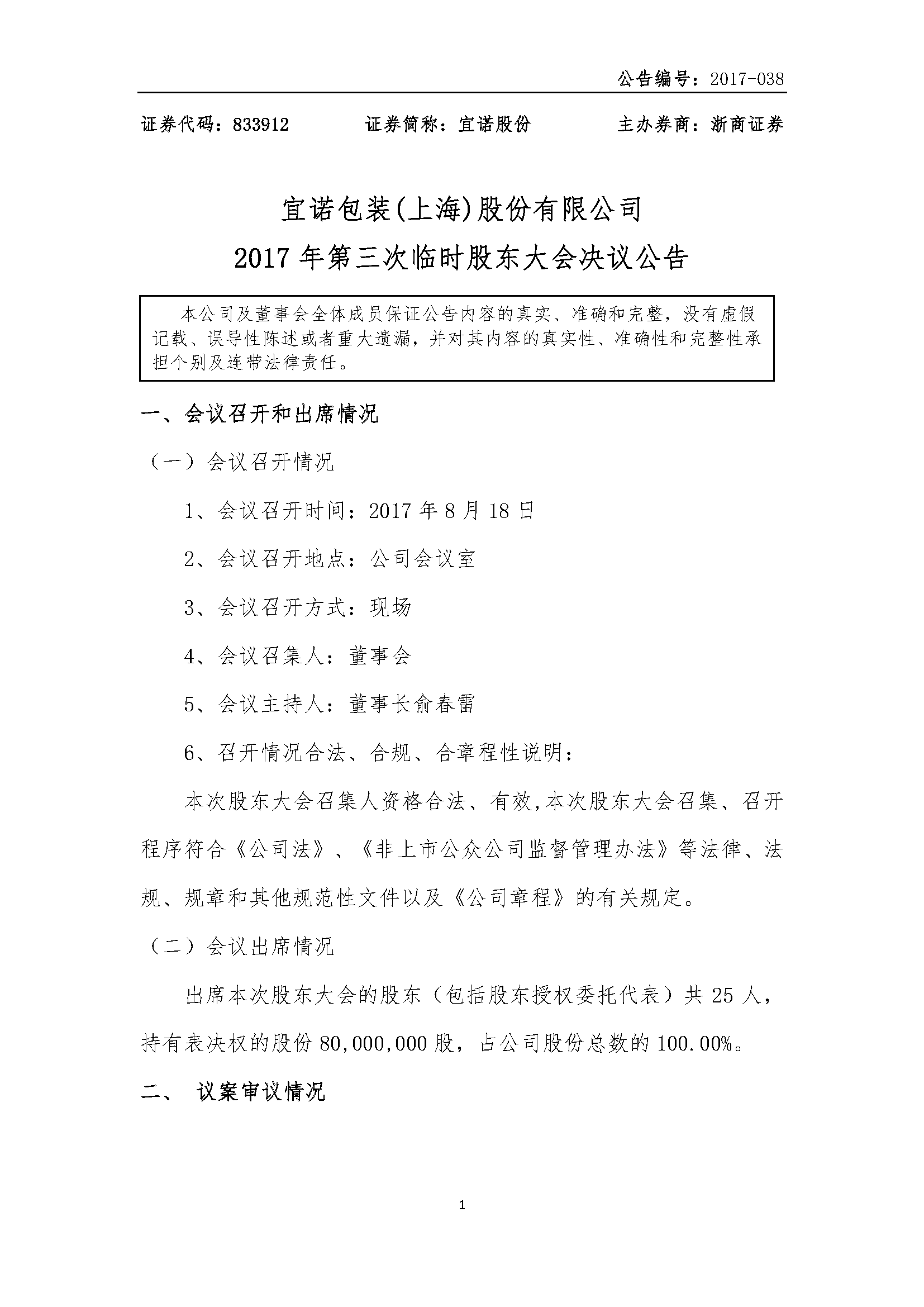 [临时公告]宜诺股份:2017年第三次临时股东大会决议公告