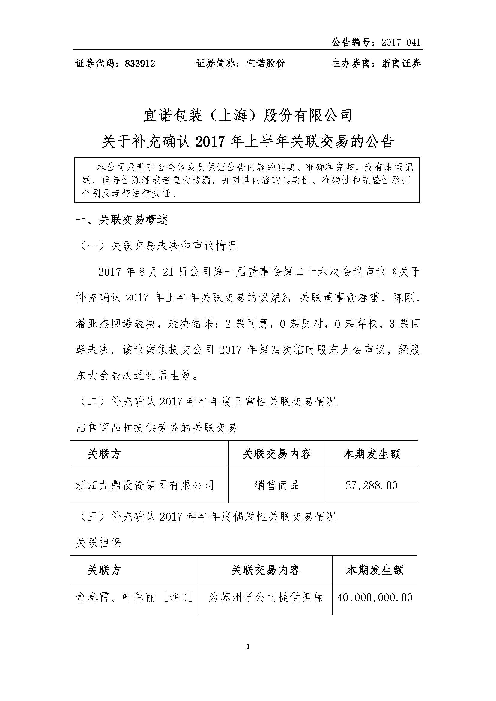 [临时公告]宜诺股份:关于补充确认2017年上半年关联交易的公..