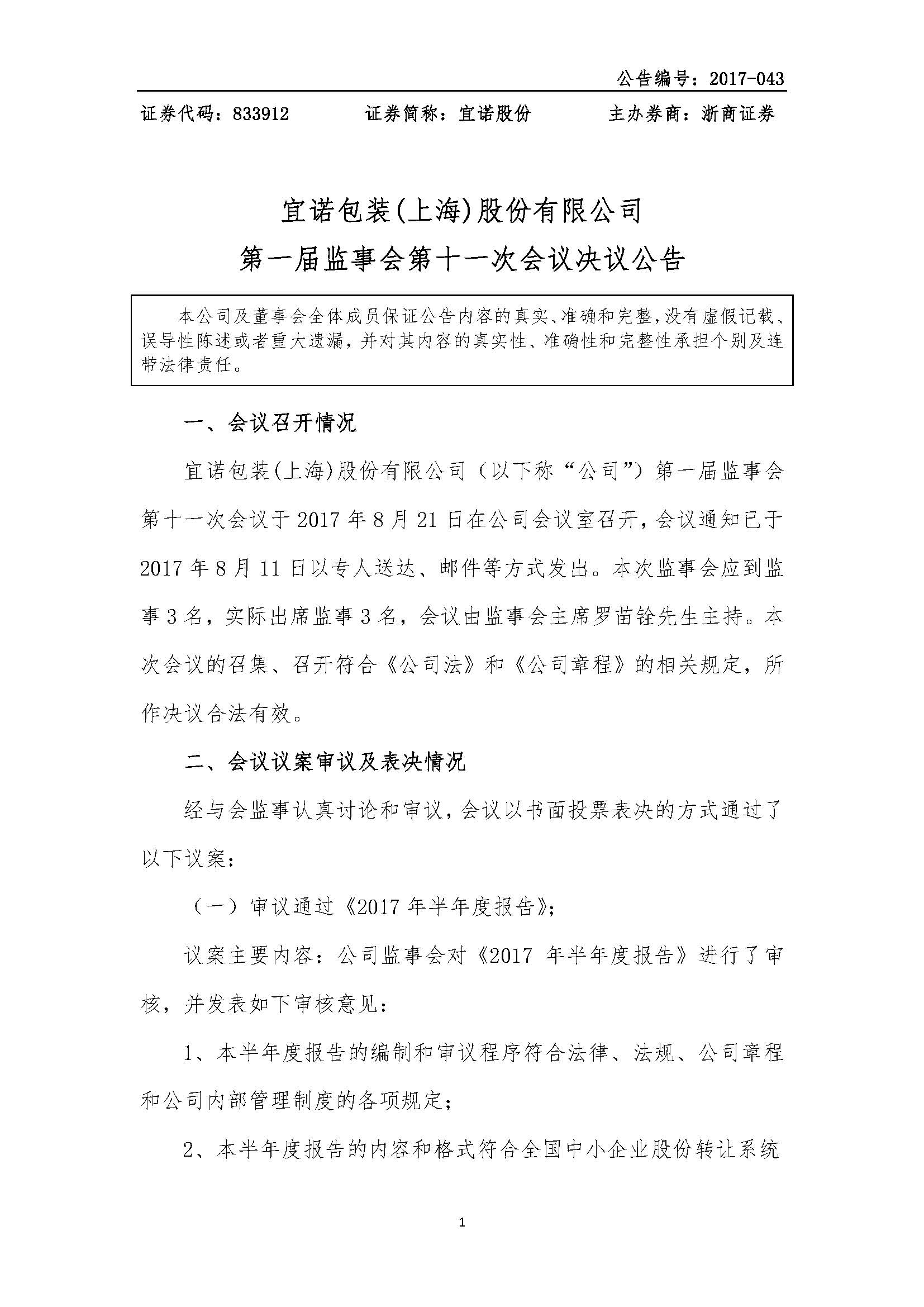[临时公告]宜诺股份:第一届监事会第十一次会议决议公告