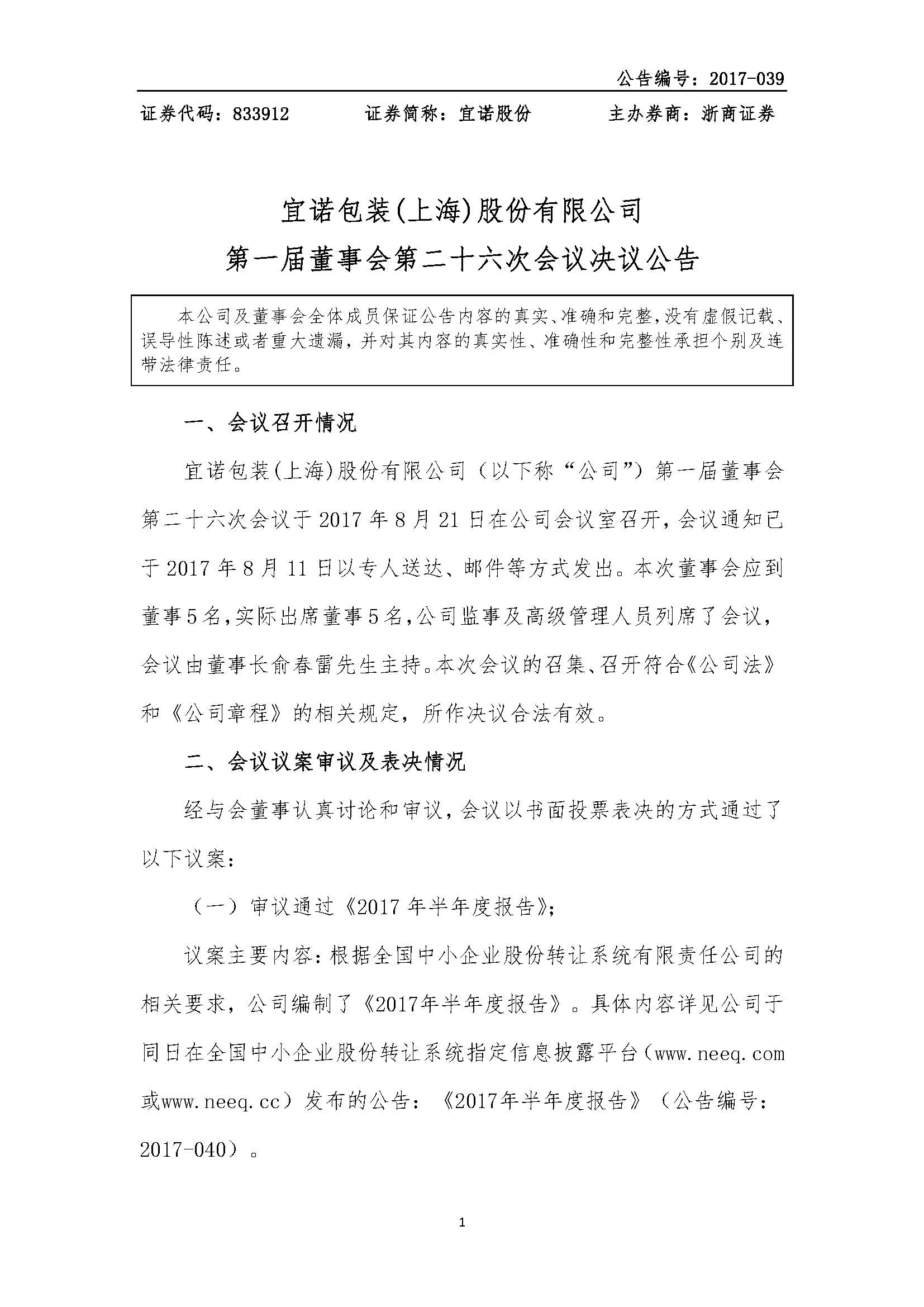 [临时公告]宜诺股份:第一届董事会第二十六次会议决议公告