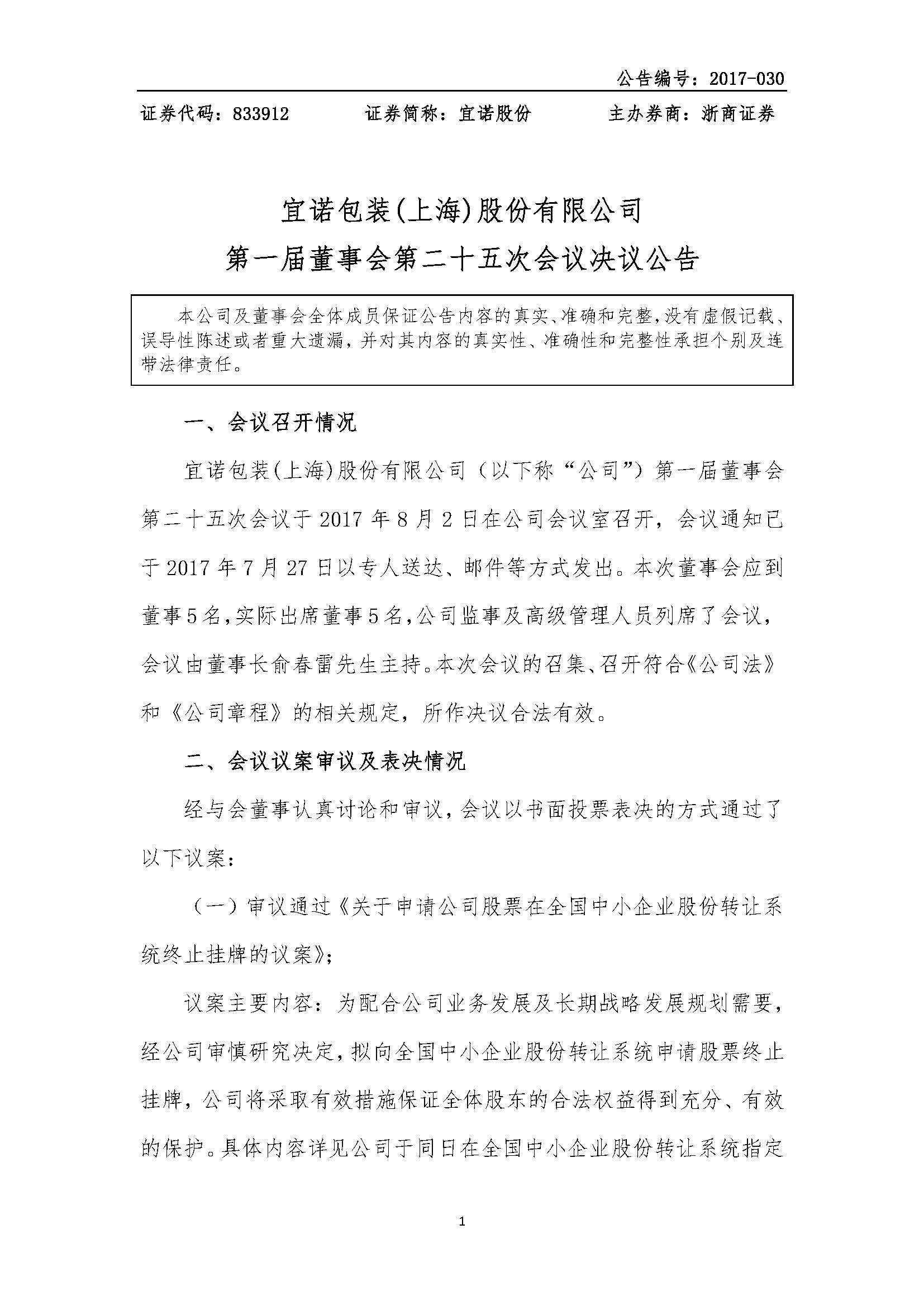[临时公告]宜诺股份:第一届董事会第二十五次会议决议公告