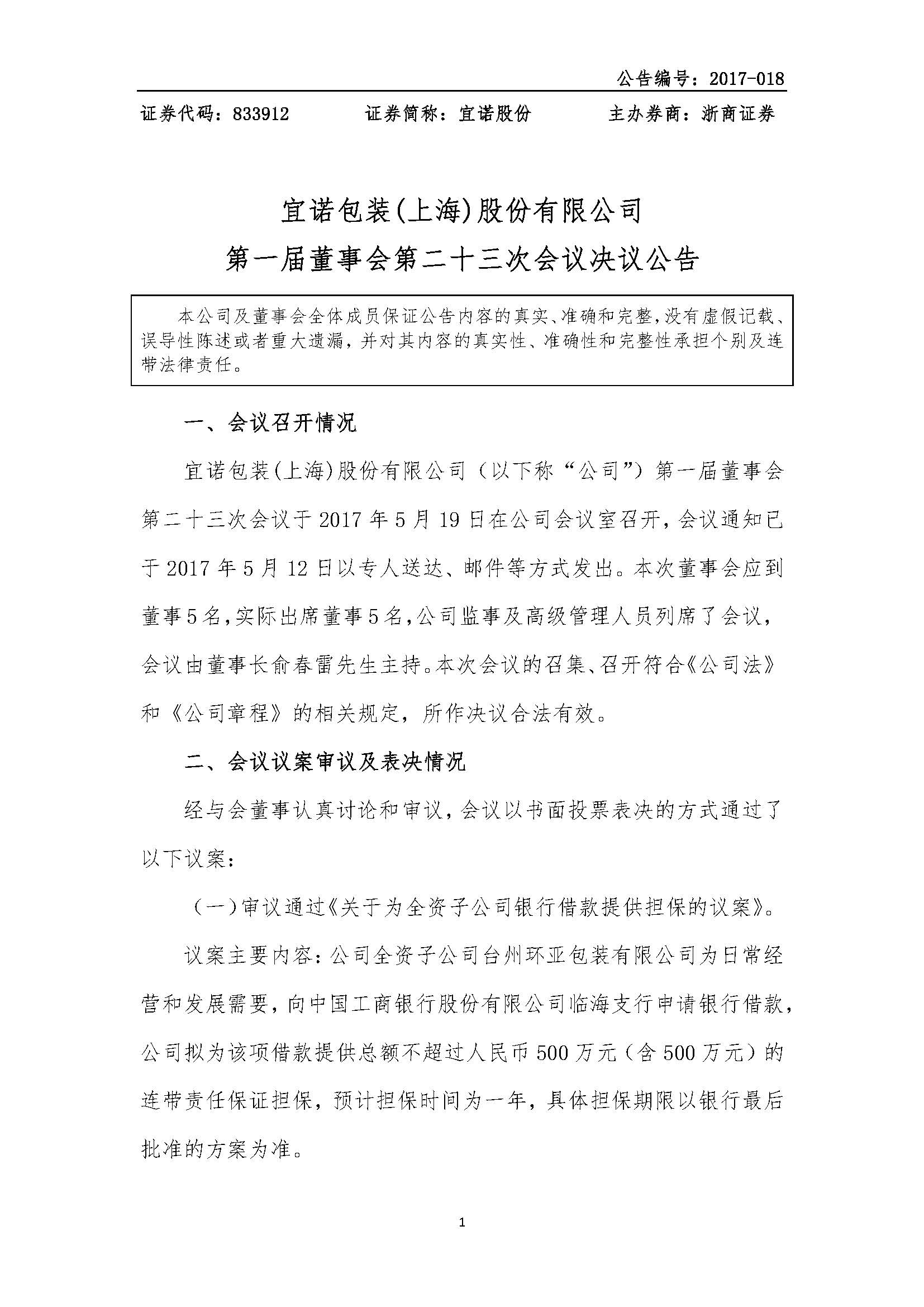 [临时公告]宜诺股份:第一届董事会第二十三次会议决议公告