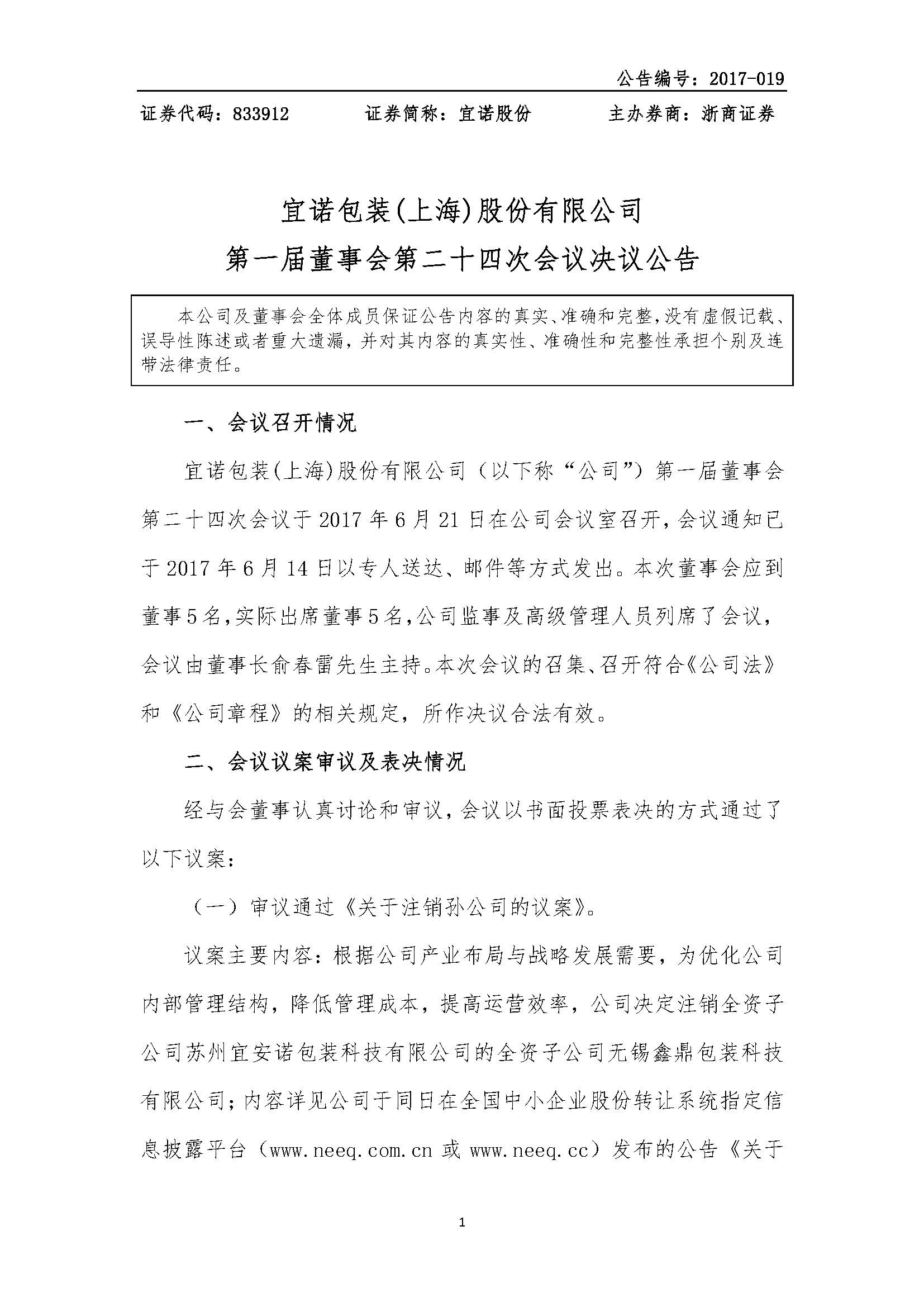 [临时公告]宜诺股份:第一届董事会第二十四次会议决议公告