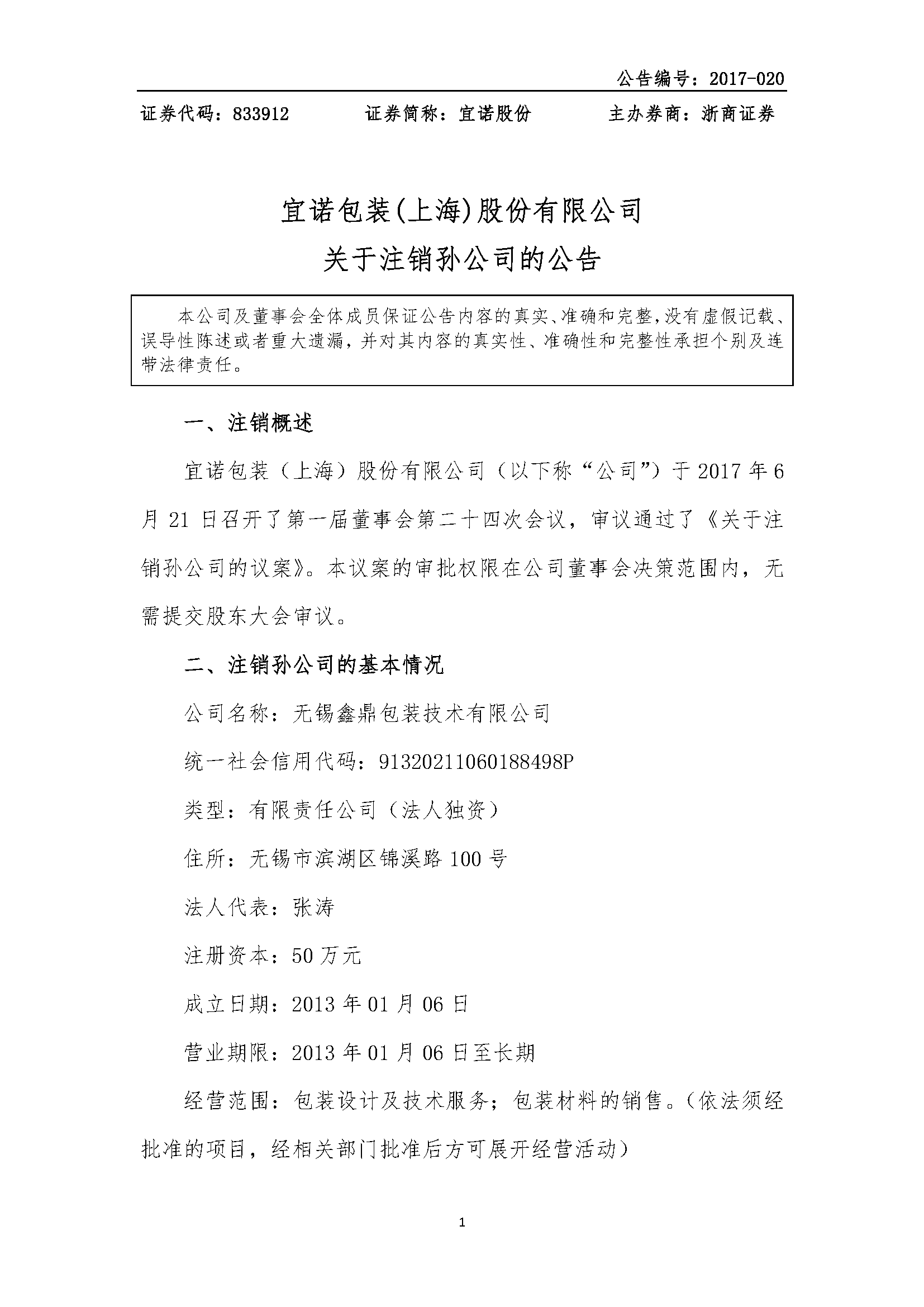 [临时公告]宜诺股份:关于注销孙公司的公告