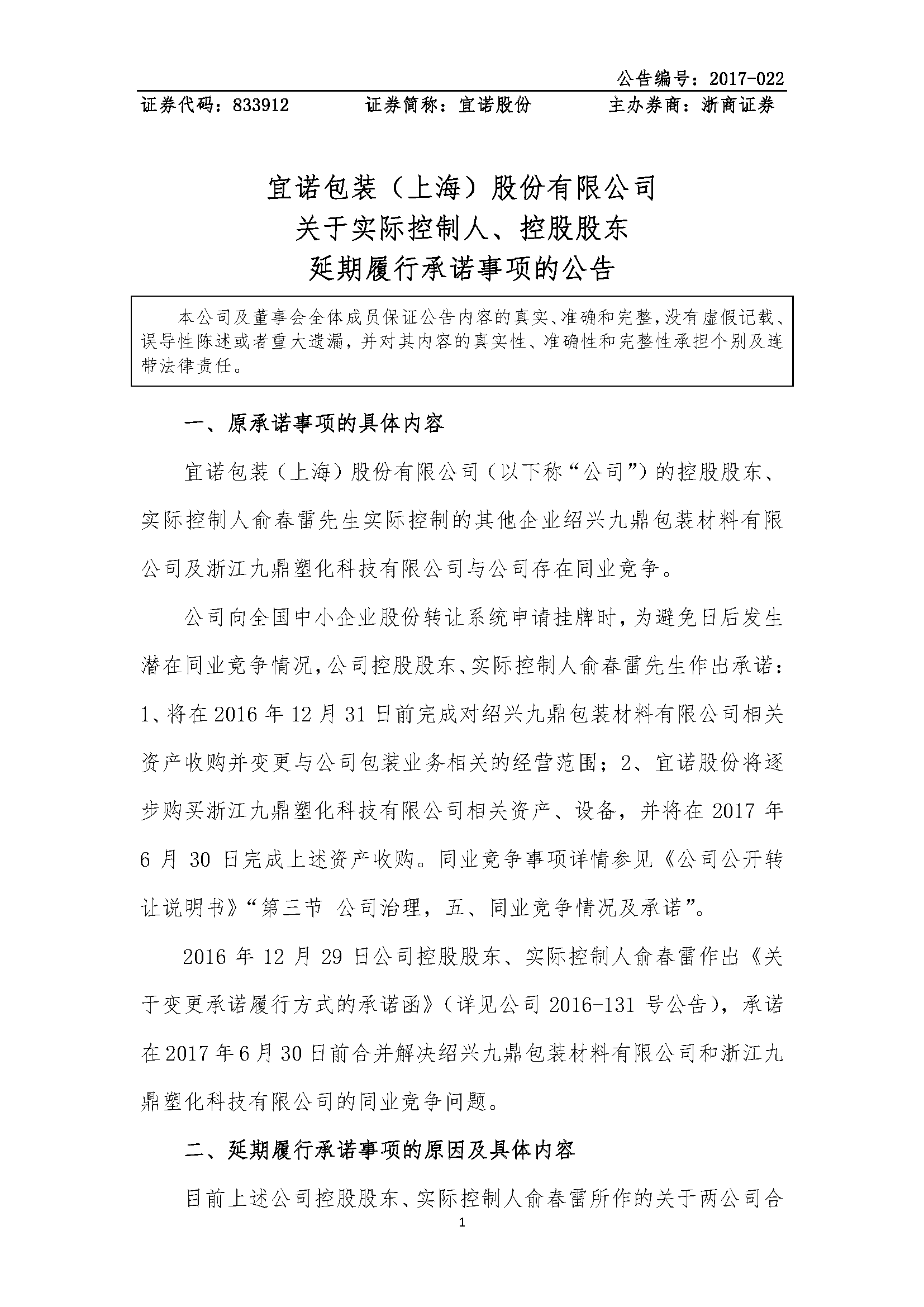 [临时公告]宜诺股份:关于实际控制人、控股股东延期履行承诺..