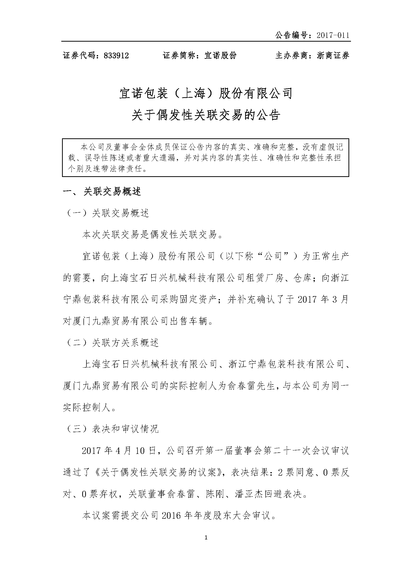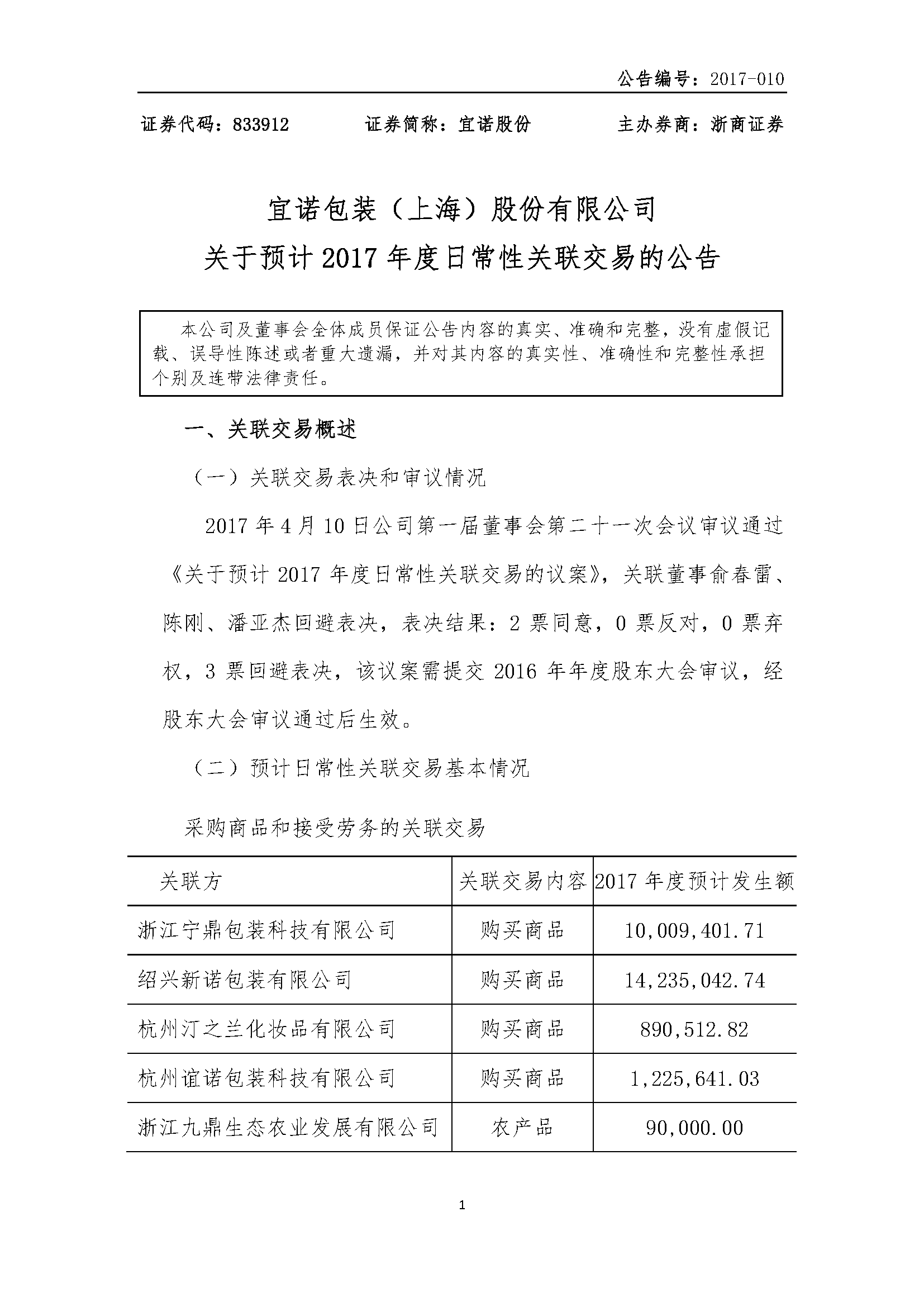[临时公告]宜诺包装:关于预计2017年日常性关联交易的公告