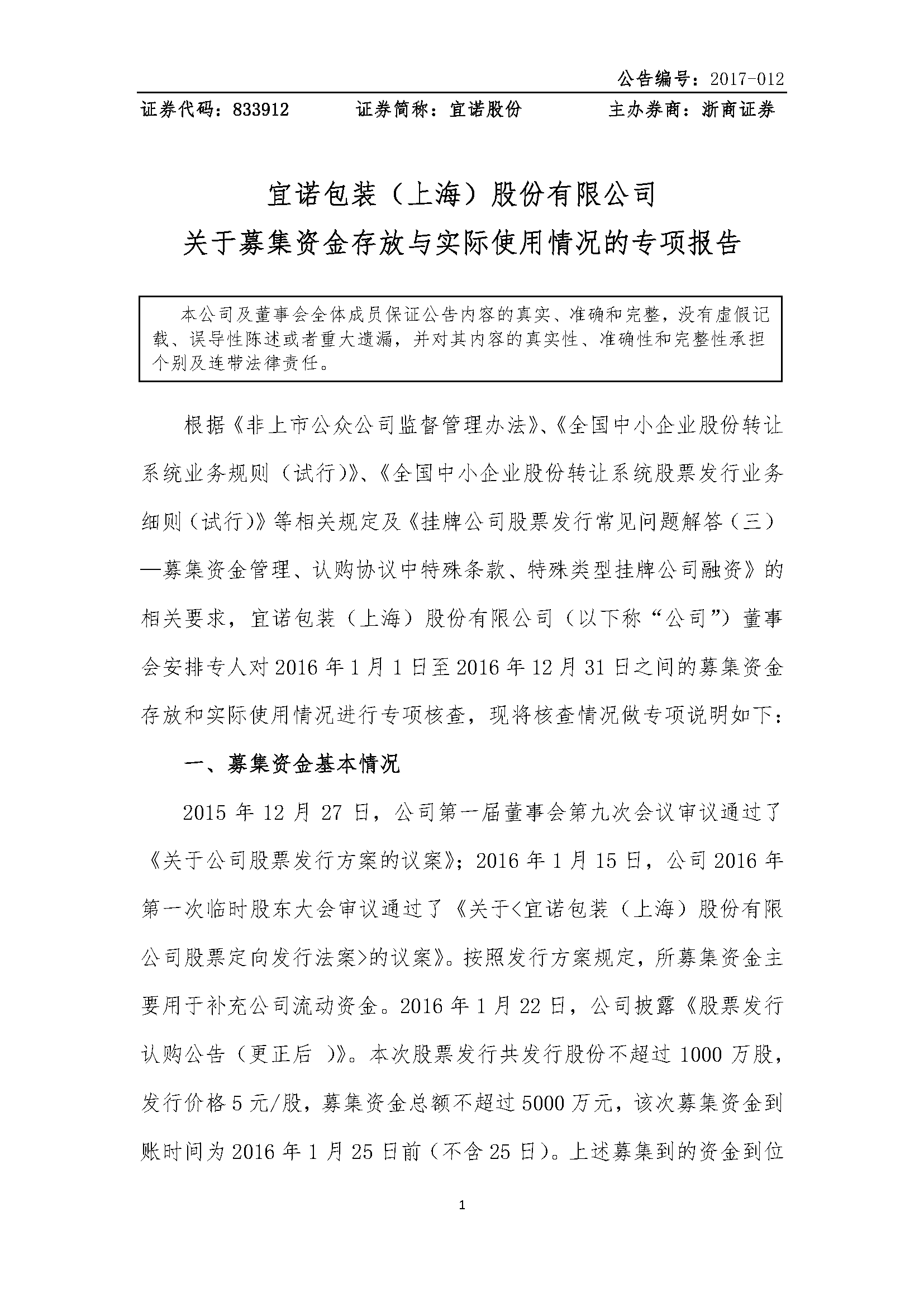 [临时公告]宜诺股份:关于募集资金存放及使用的专项报告
