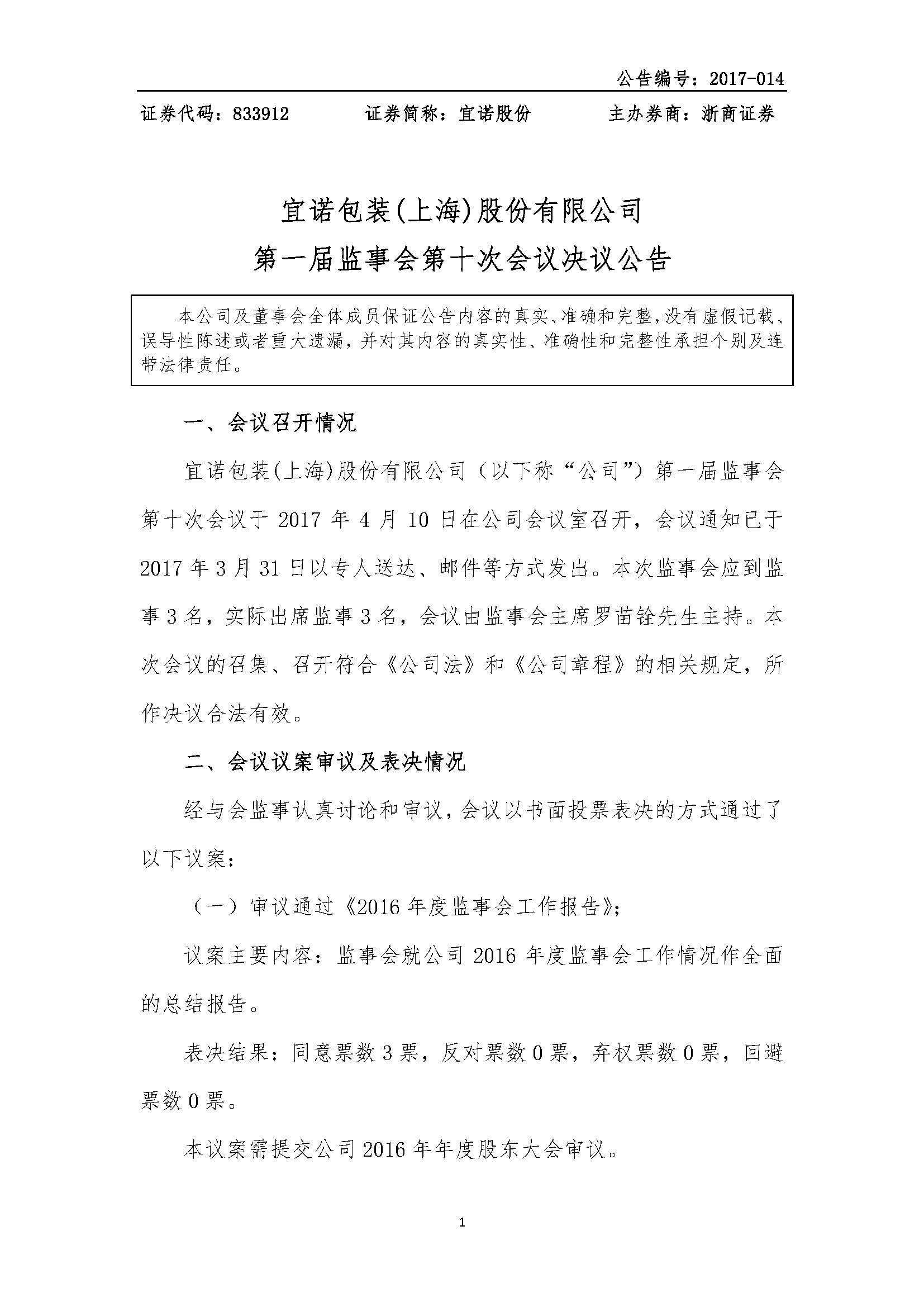 [临时公告]宜诺股份:第一届监事会第十次会议决议公告
