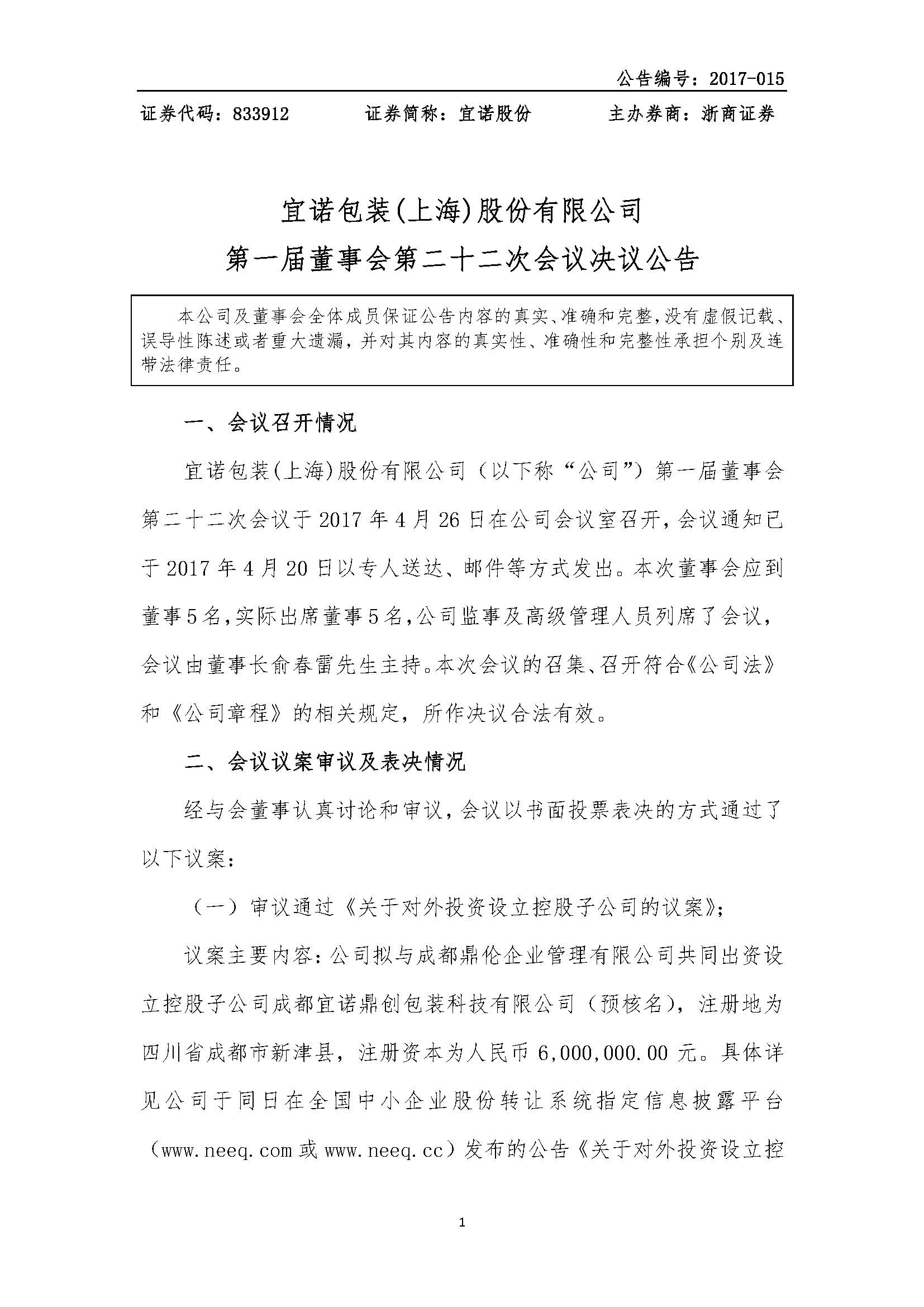 [临时公告]宜诺股份:第一届董事会第二十二次会议决议公告