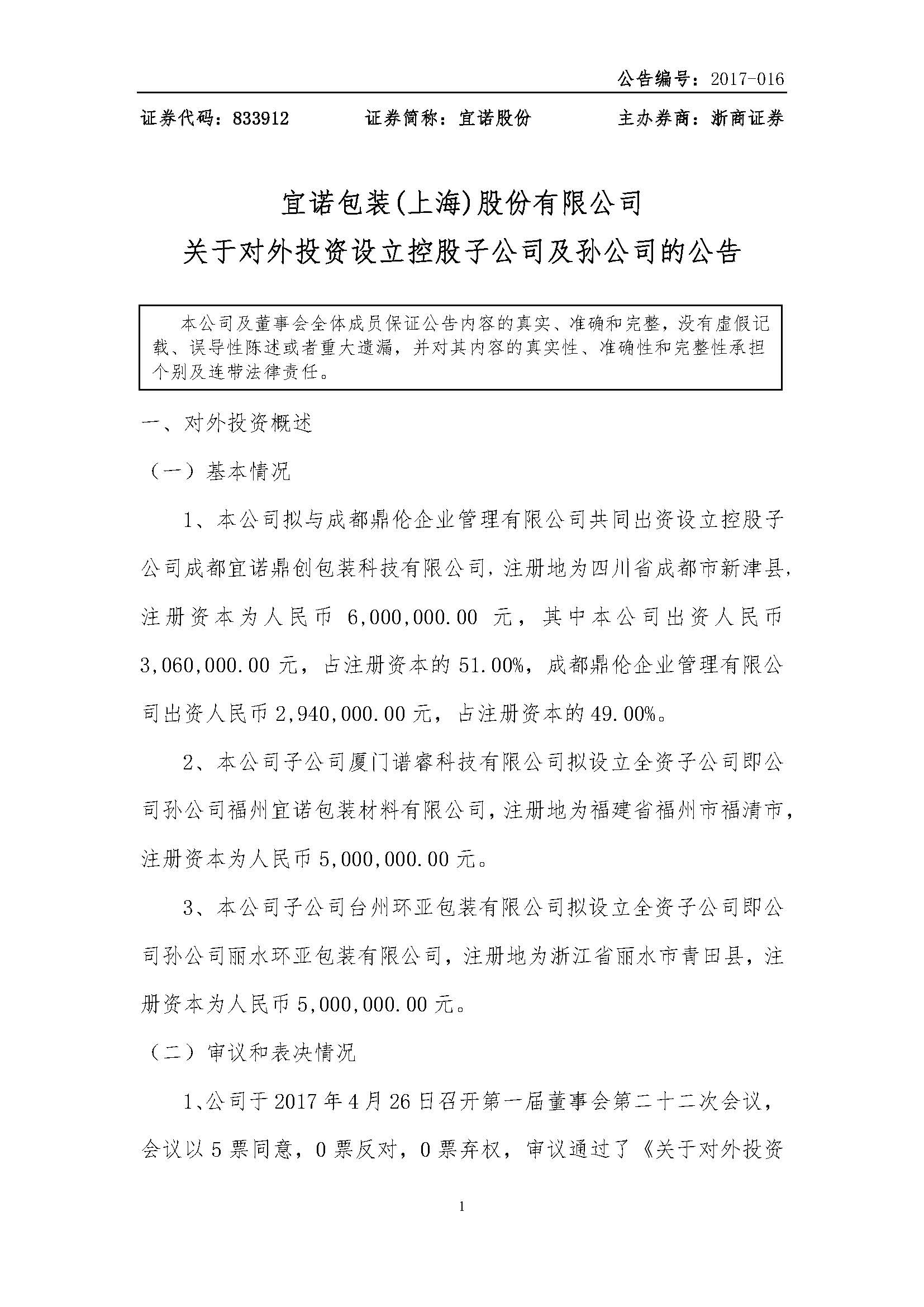 [临时公告]宜诺股份:关于对外投资设立控股子公司及孙公司的..