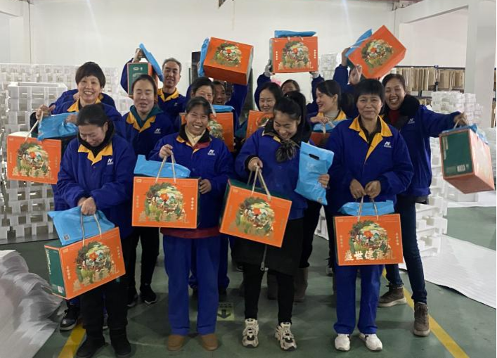 在这寒冷的冬季,为了使每一位员工都能感受到家的温暖,特地在这团圆喜庆的小年夜由综管部为大家送上福气满满的春节礼盒!在礼盒发放现场,大家默契配合、分工合作,将100余份春节礼盒与化妆品福利整齐摆放,将承载着公司关怀的礼盒福利一份一份的送到每位员工手中,“枣降吉祥”寓意美好,也是公司对各位员工的新年祝福!